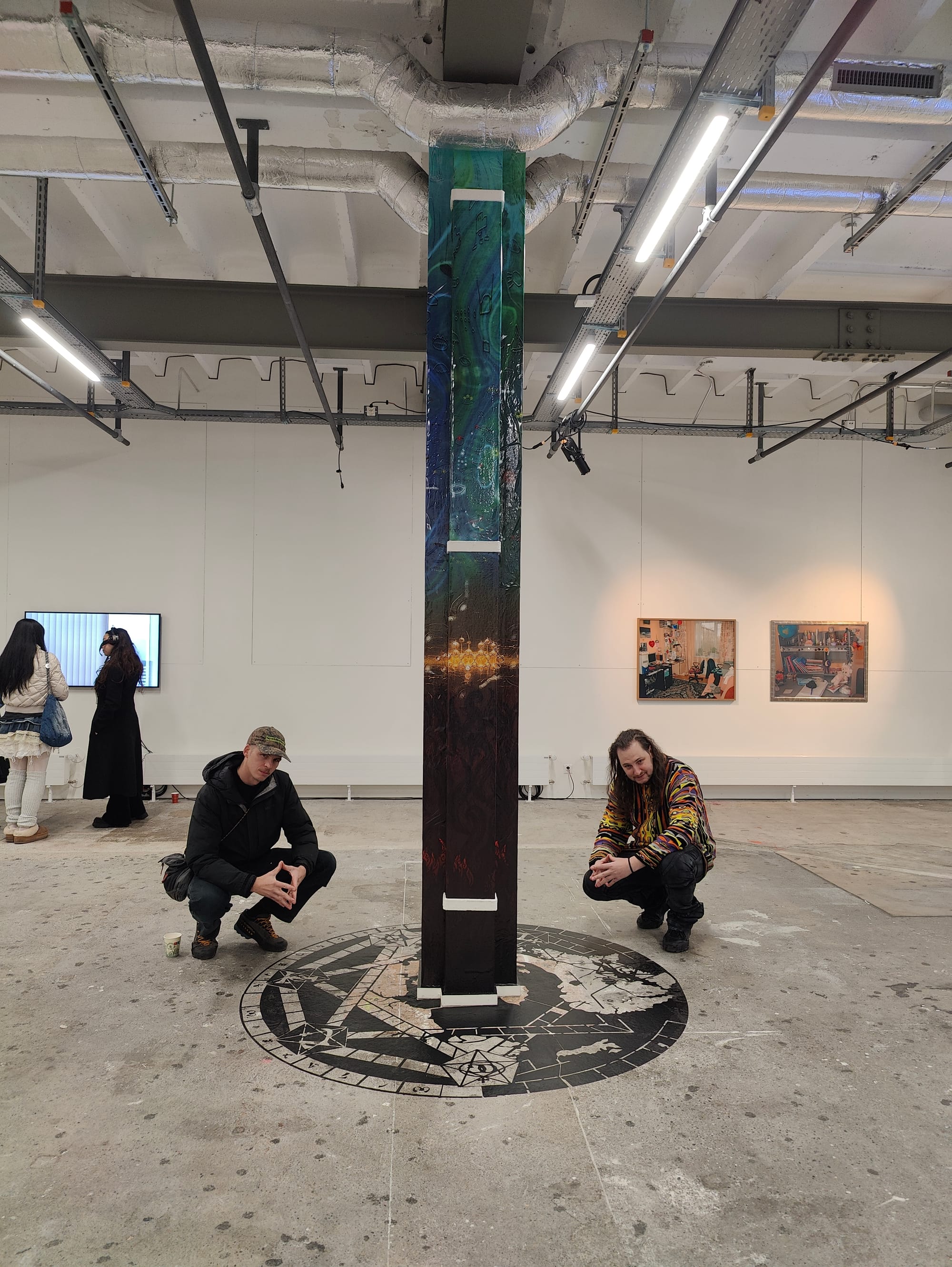 Dec 2 - Geneva, CH - The curating team, For The Win, first approached me in March and we began a series of zoom calls discussing a contribution to the second edition of the "Art, Games & Society" biennial in Geneva. The first edition in 2023 was titled The Seashore of Endless Worlds and centered around board games, card cards and modes of simulation. Geneva is part of the Swiss-French region of the country and the French phrase for board game is jeux de société, which holds a certain poetic potential for thinking about gaming as a political metaphor, à la Guy Debord. Needless to say, I was hooked. This year's edition, Side Quests For The Real, focused on LARP (Live Action Role Play) as an anchoring device for the show and invited a number of artists to craft LARP performances for the exhibition space. Over the next 7 months I researched, created, produced, cut, transported and installed a site-specific installation titled "Spooky Action At A Distance." The two floors of the exhibition space, Le Commun, were activated with magic circles and columns emanating upwards. The whole experience was challenging and fruitful. I had never created a site-specific work for a space remotely and I had never worked in a wallpaper print before. (ok the Spooky Castle install was remote, but it was an existing work that was adapted, so a little different). All-in-all, I am thrilled with how it came out. Traveling to Switzerland was a real treat. I have lot more to share from my travels soon, so look out for that, along with a full essay unlocking all the research and references from John Dee to CERN that went into my installation.
