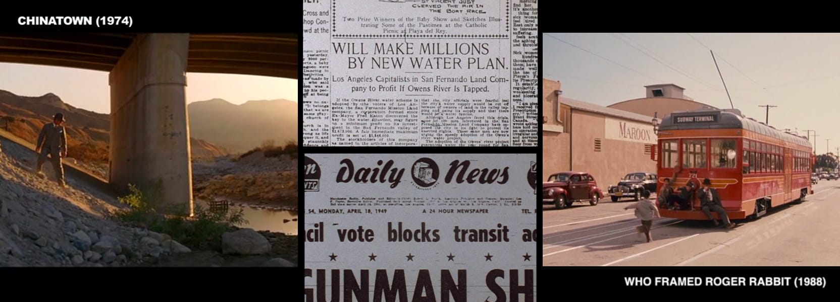 Dam building, trolley divestment, housing projects and police brutality were all hotly debated in their own time and settled through city council votes. The powerful lobbies that swayed these votes, supported or denied public projects were widely known, not masterminds controlling situations from the shadows as portrayed in the films. The conspiracy villain makes for a much better movie and our historical amnesia is such that the impact of these films supplants collective memory. Chinatown's conspiracy of water rights expropriation and pedophilic robber barrens has become the lingua-franca for the founding of Los Angeles and dissolves the egalitarian story of bringing water to the masses that the film is based on. The conspiracy is simply a better story and in the age of images, the best story wins the day.