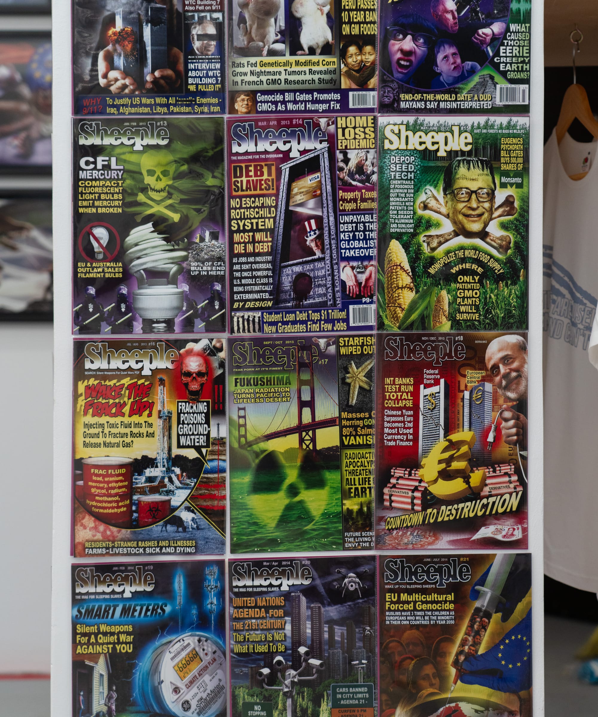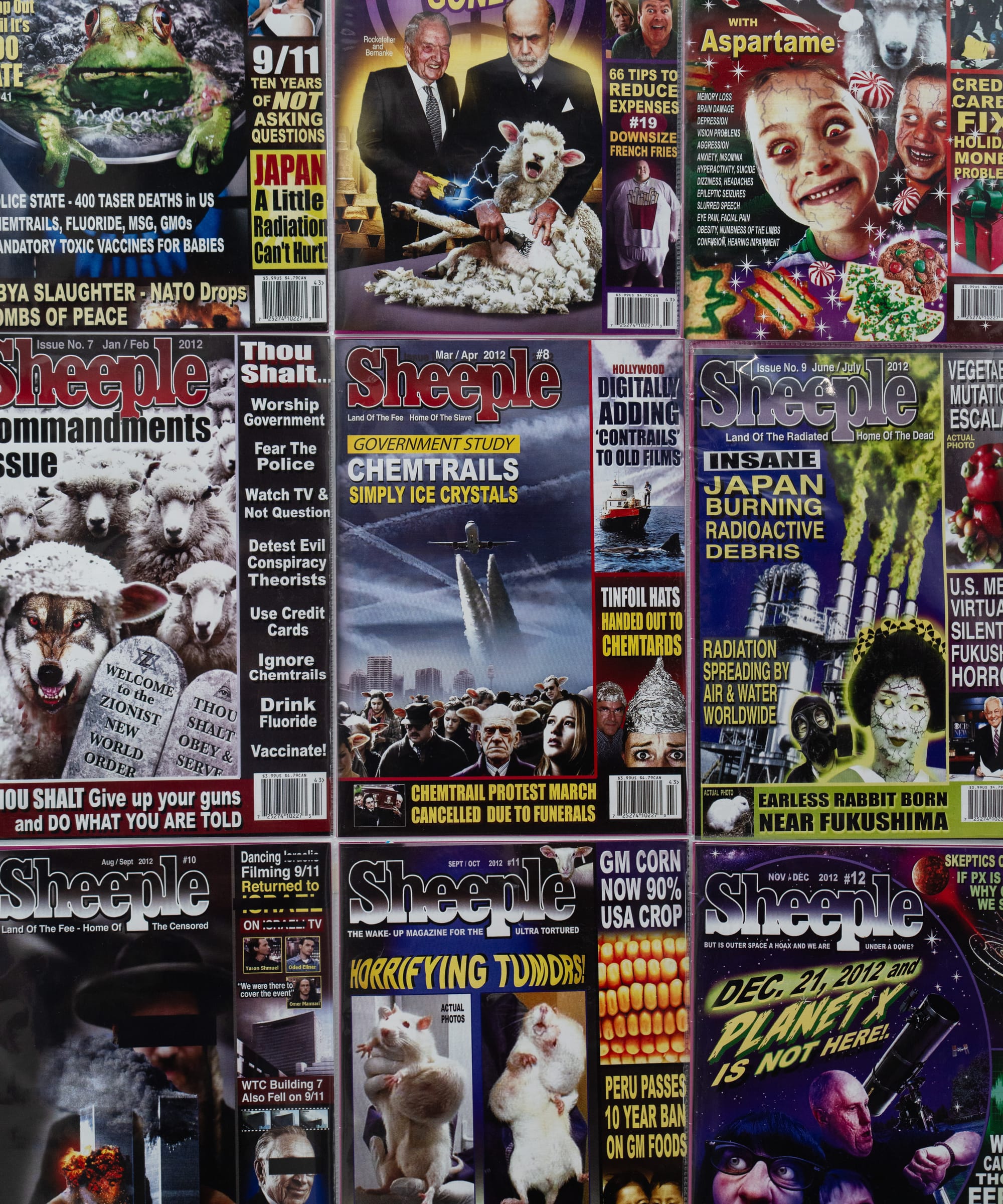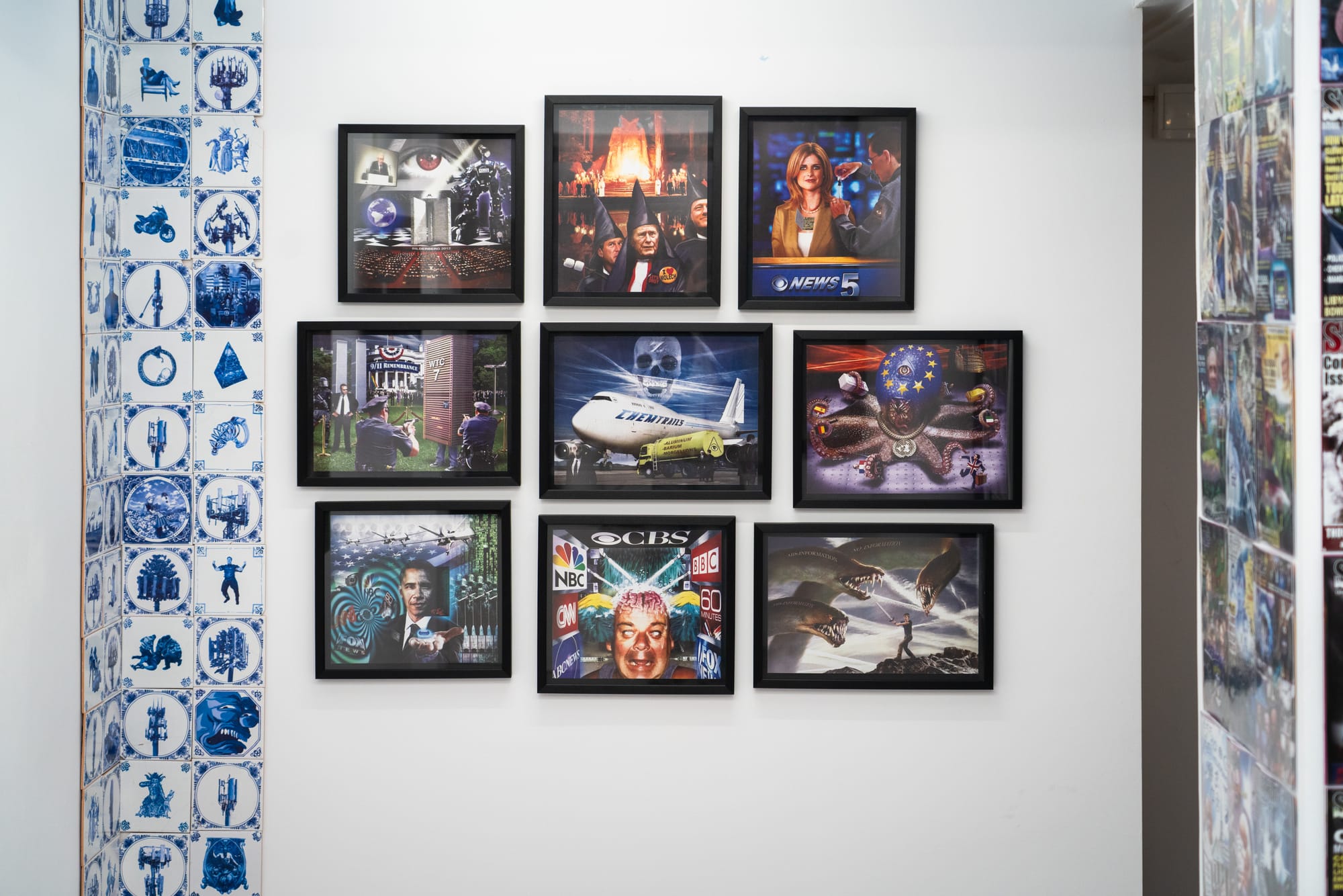 David Dees (1957-2020) on view at "Man-made Horrors Beyond Comprehension" at Pharamkon Gallery, left: a selection of iconic digital collage prints, right: rare & never-before seen covers from Dees's hypothetical glossy periodical, Sheeple Magazine