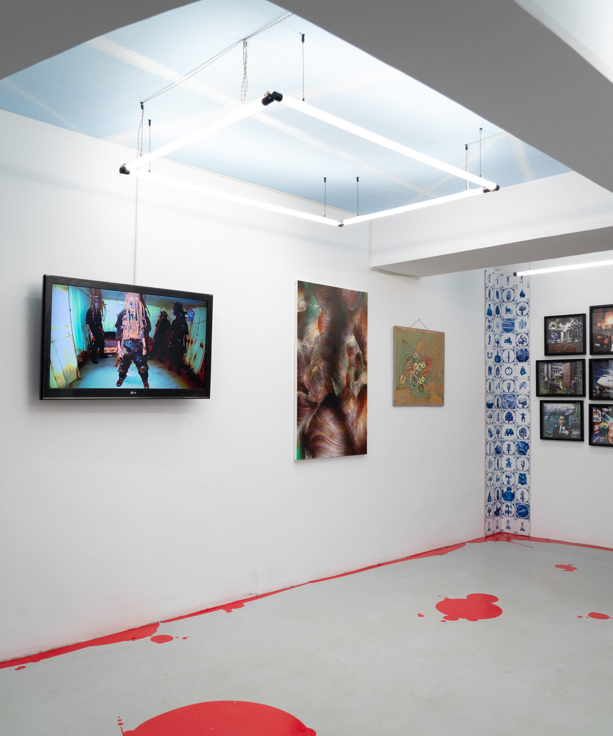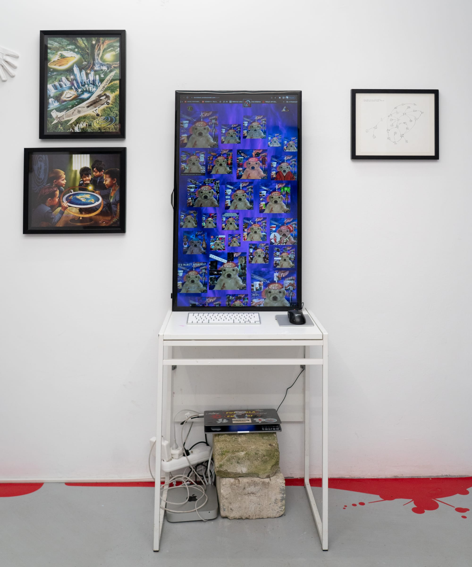 Left: "Extremely Online Deft" Tibor Dieters, ceramic "MMade_H04404_B_comp_De-Sublimate_16x9_1920x1080_renderFINAL.mkv" Jak Ritger, vinyl - Center: Work by Jon Rafman, Andrei Nitsu, Gloria Frau - Right: "EFTA00001827.pdf" Jak Ritger, aerosol & acrylic
