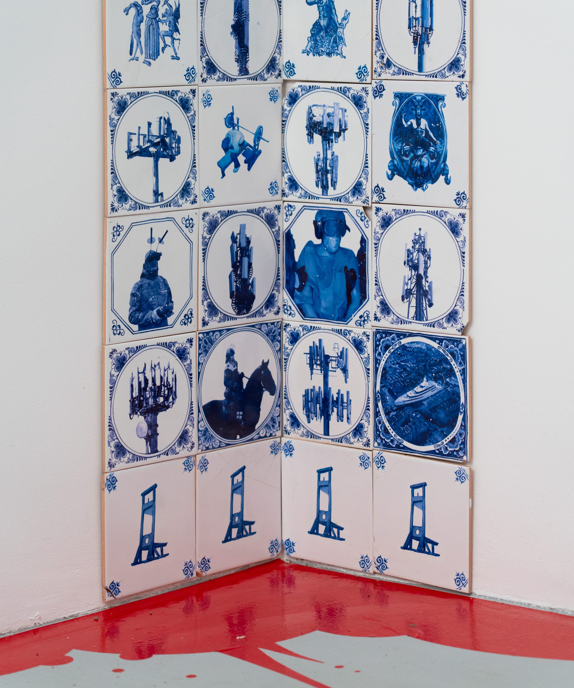 Underneath the cross-crossing pathways lies ephemeral evidence of evil. Oozing out from under the walls seeps plotter-cut vinyl blood spills. Ever present throughout Dees's pictures is the implicit threat of violence. The body is a site for covert cognitive experimentation, slow negligent chemical decay and sudden bursts of horrific weaponry. It is the real destroyed bodies, the splattered blood, the carnage and corpses that demand theories of conspiracy, for how could a just God or fair rulers allow such atrocities to take place? At its most base level, conspiracy thinking is an attempt to make sense of a chaotic and brutal world.