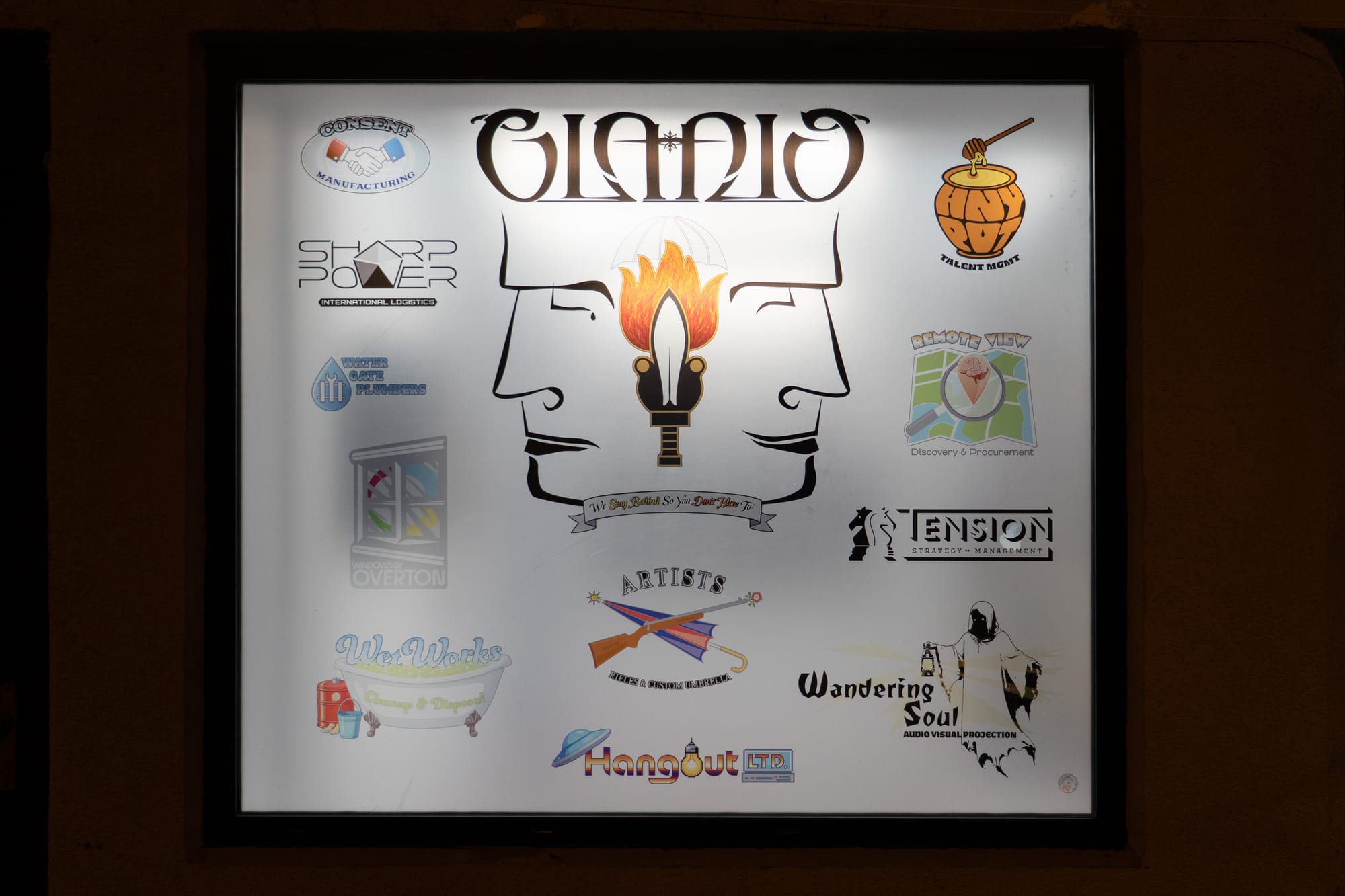 I first started with this ambigram letterform design. It was definitely the most challenging to execute. When I was in middle school The Da Vinci Code was all the rage and became obsessed with the prequel Angels and Demons by Dan Brown. The book popularized the Illuminati / Knights Templar conspiracy theory and featured incredible ambigram designs by the John Langdon. I would spend days designing ambigrams for the names of my friends for birthday cards. I guess the skill of contorting letters into rotational or mirrored symmetry never left me. Once I had decided on a transparent window print as the format for the piece, I knew i had to create an Gladio ambigram logo so that it would read inside the gallery as well as from the street. The center star motif is a reference to the NATO logo. I wanted to callout the dual movement of the stay-behind program: western powers encouraging free and open democracy while funding and promoting subversive far-right terrorism in order to push back the encroachment of Communism. The official Gladio coat of arms is center stage - the sword, flame and parachute represent the undercover violent operations dropped into peaceful nations. Surrounding the coat of arms is a smiling / crying Janus, the greek god of transition. Janus is watching over this transitional phase of history with horror and glee, a theater of secrecy and rumors.