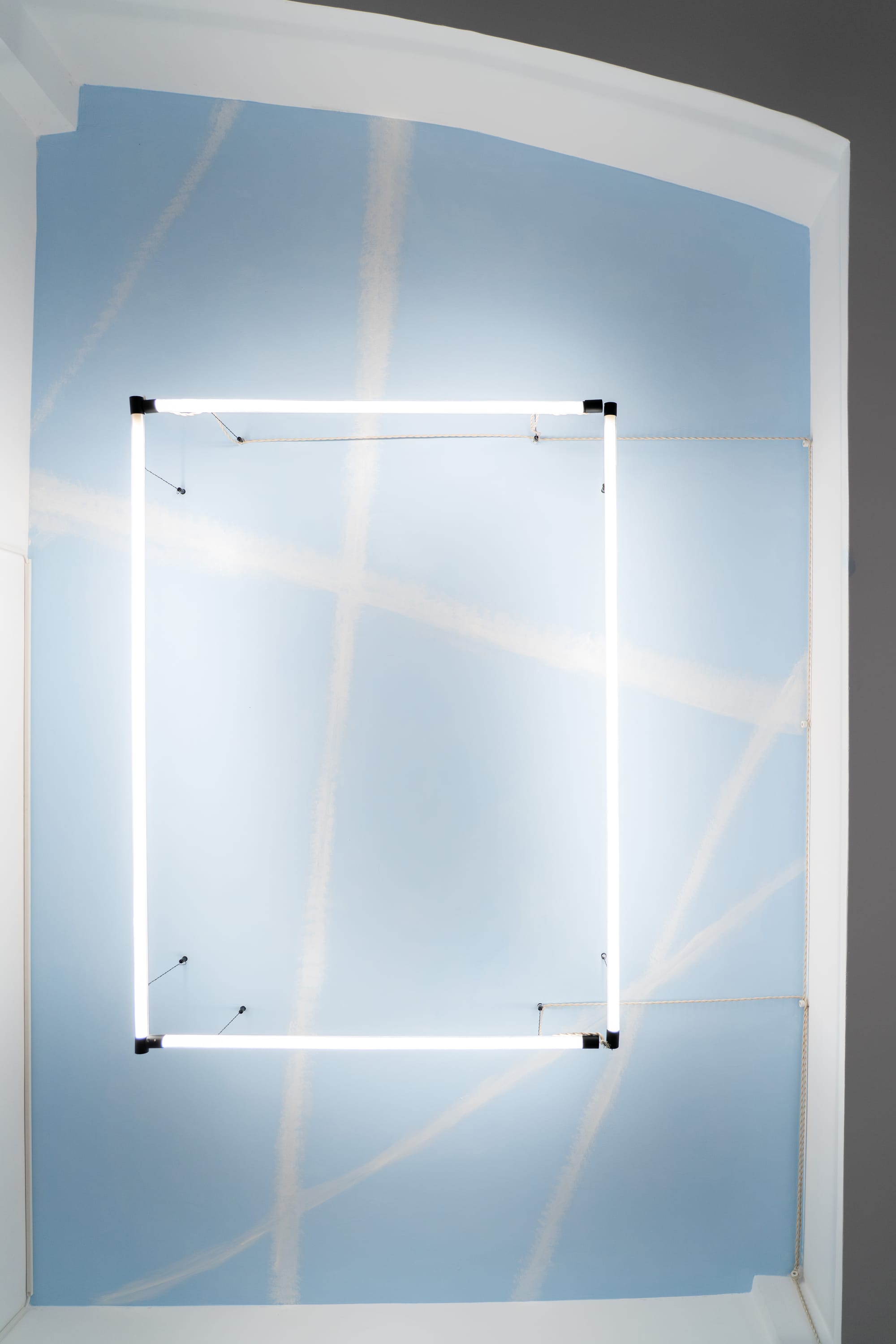 The reoccurring motif in Dees's pictures is the chemtrail. He paints the toxic airline exhaust tails into almost every daytime skyline throughout his work. The chemtrail / contrail conspiracy is perhaps the most prevalent of all contemporary paranoia stories for its visual accessibility (just look up in the sky on any given day) and the accepted truth (airline pollution is toxic and contributing to global warming.) There is also a certain poetic quality to the vapor streams streaking across the near-heavens, connecting faraway places, people and ideas. The dotted dissipations marking the journeys our spirits take after passing on. I conceptualized a painted chemtrail ceiling for the exhibition as a gesture of connection between the works included in the show and as an opening up of a horizon of understanding — an invitation to take what you can from corporeal experience and make peace with the unknowable. Perhaps this decadent vista can offer solace to those on a journey out of dark places.